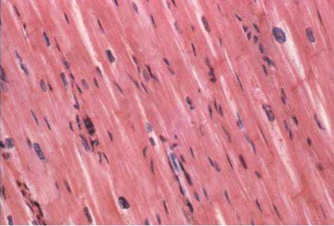 Este tipo de tejido muscular forma la mayor parte del corazón de los vertebrados. Las células presentan estriaciones longitudinales y transversales imperfectas y difieren del músculo esquelético sobre todo en la posición central de su núcleo y en la ramificación e interconexión de las fibras. El músculo cardiaco carece de control voluntario. Está inervado por el sistema nervioso vegetativo, aunque los impulsos procedentes de él sólo aumentan o disminuyen su actividad sin ser responsables de la contracción rítmica característica del miocardio vivo. El mecanismo de la contracción cardiaca se basa en la generación y trasmisión automática de impulsos.